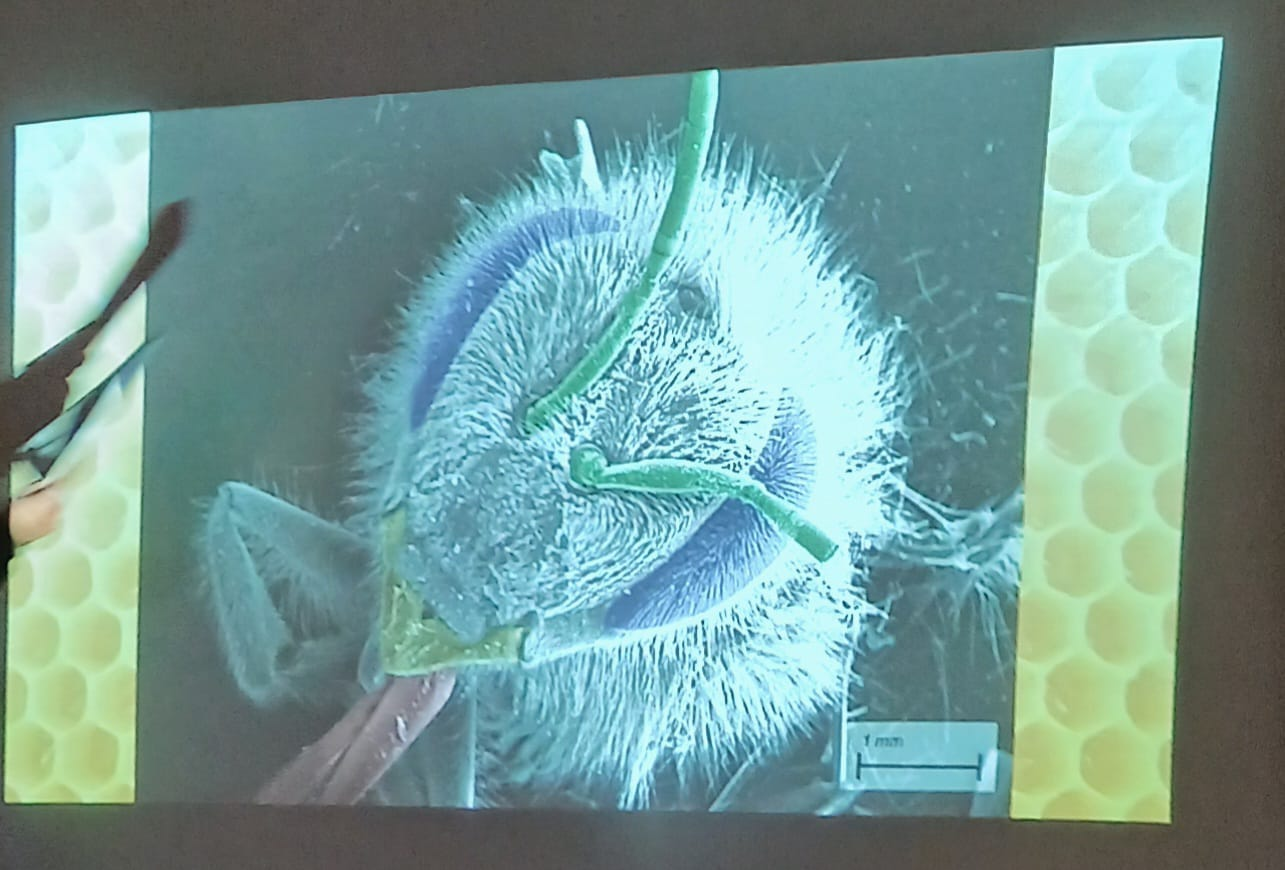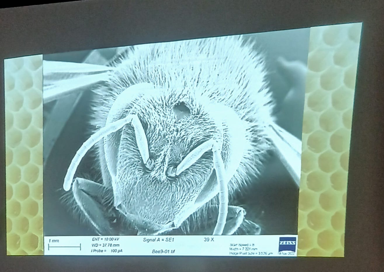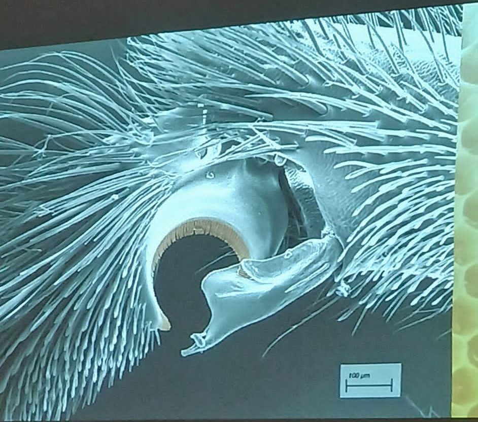 Those who made it, were in for a treat.  Tim shared with us some extremely detailed images of the anatomy of honey bees. This was something beyond your usual microscope images.  I have never used a microscope (maybe once in biology at school, but I really can’t remember it) but the one Tim used was on another level.  He had managed to get permission for the use of a high-powered, £30,000 all-singing-all-dancing electron microscope from Birmingham University.  For those who have some knowledge of electron microscopes, you may know that to use them, the subject has to be able to conduct electricity.  To solve this issue in bees (they are notoriously bad at conducting electricity — apparently!) they had to be gilded in gold.  I imagined Tim painstakingly cutting up gold leaf into 6 mm sections to cover a bee.